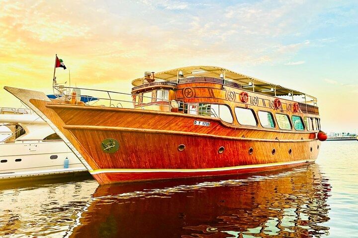 Experience the ultimate luxury with a Dubai Dhow Cruise along the New Water Canal. This 2-hour cruising journey offers breathtaking views of some of Dubai’s most iconic landmarks, including the Palazzo Versace, Burj Khalifa, SZR skyline, Festival City, Business Bay Canal, and Dubai Creek Harbour. Enjoy a delicious international buffet dinner with a variety of both vegetarian and non-vegetarian dishes, accompanied by unlimited soft drinks and water. While you cruise, you’ll be entertained by live shows on board, adding to the vibrant atmosphere. Plus, with free parking and no hidden charges, it’s an unforgettable experience that combines stunning views, exquisite dining, and top-notch entertainment.